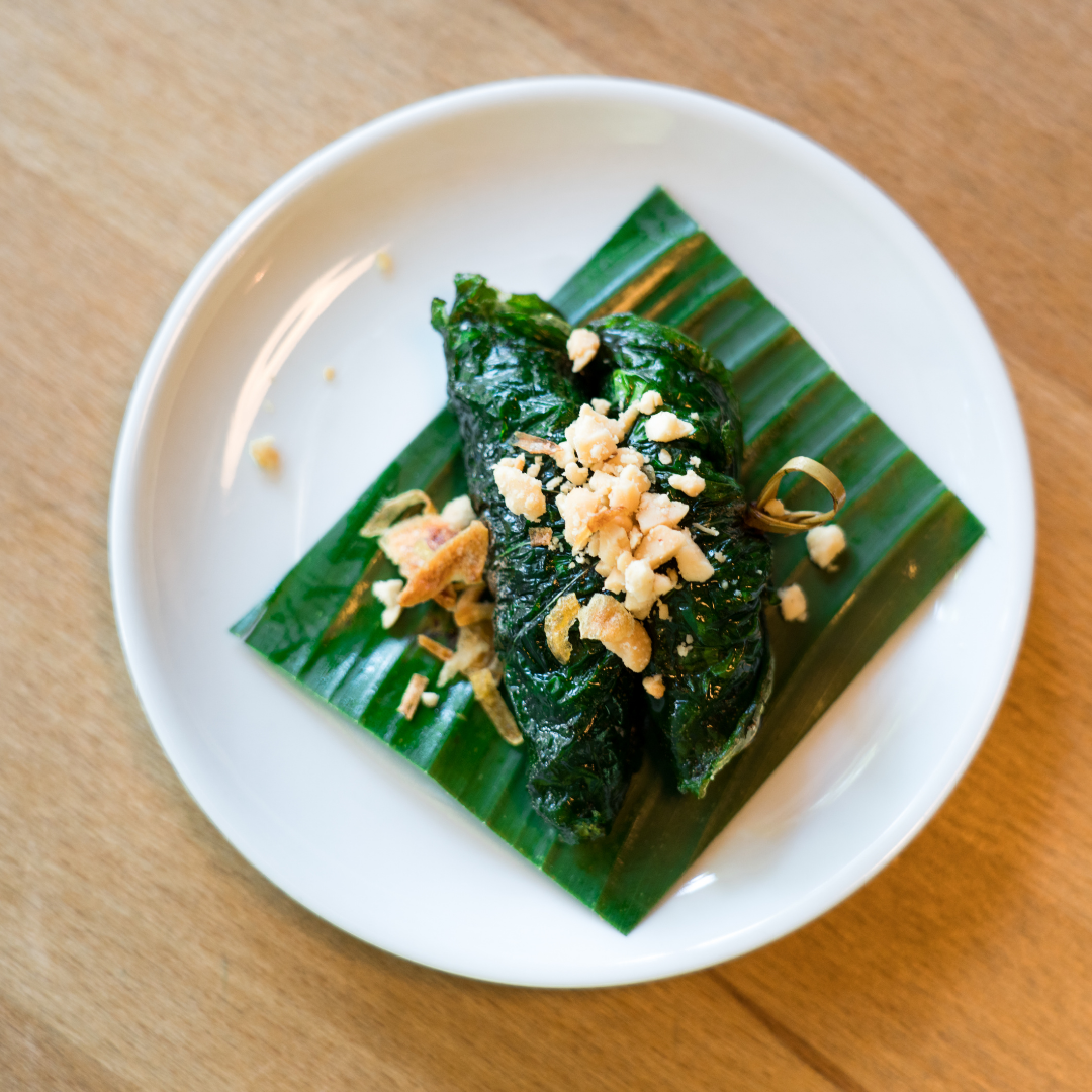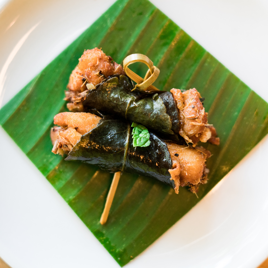 - Bo La Lot – Im Senfblatt gebratenes, gewürztes und gerolltes Rindfleisch, 2 Rollen auf kleinem Spiessli