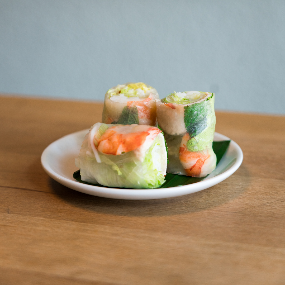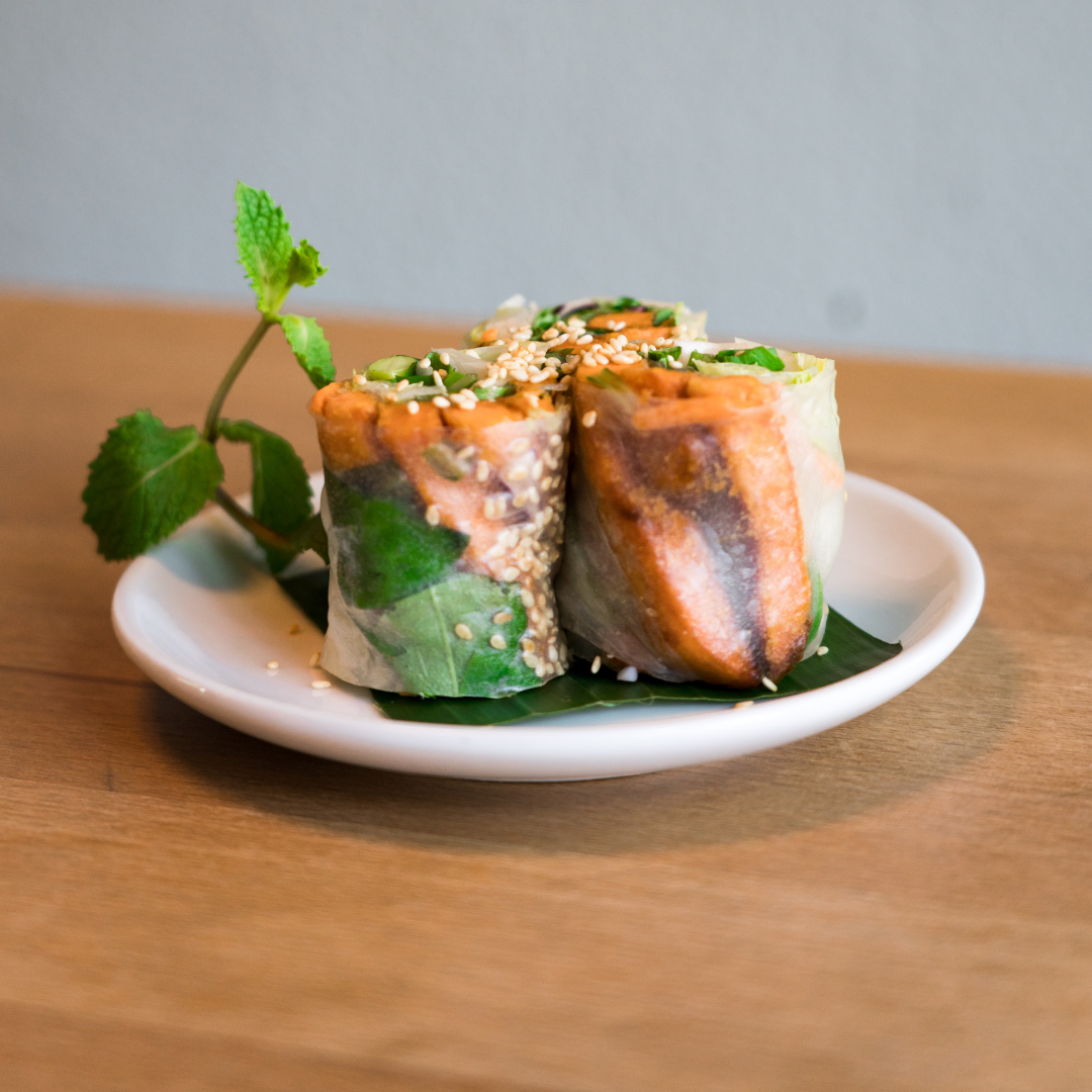 - Goi Cuon Vegan – Sommerrolle mit Tofu & Gemüse (gedrittelt) und Sauce (glutenfrei, vegan)