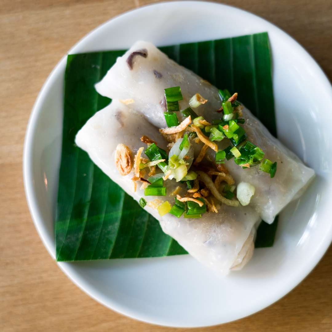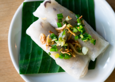 - Banh Cuon Chay – Gedämpfte Reisrollentaschen mit Tofu, Salat, Minze, Gurken, Essiggemüse, Nuoc Cham Sauce (glutenfrei, vegan)