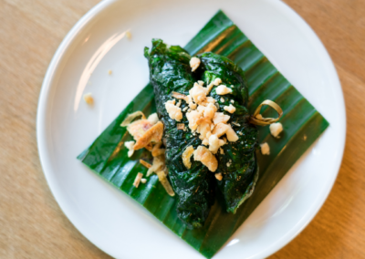 - Bo La Lot – Im Senfblatt gebratenes, gewürztes und gerolltes Rindfleisch, 2 Rollen auf kleinem Spiessli (glutenfrei)