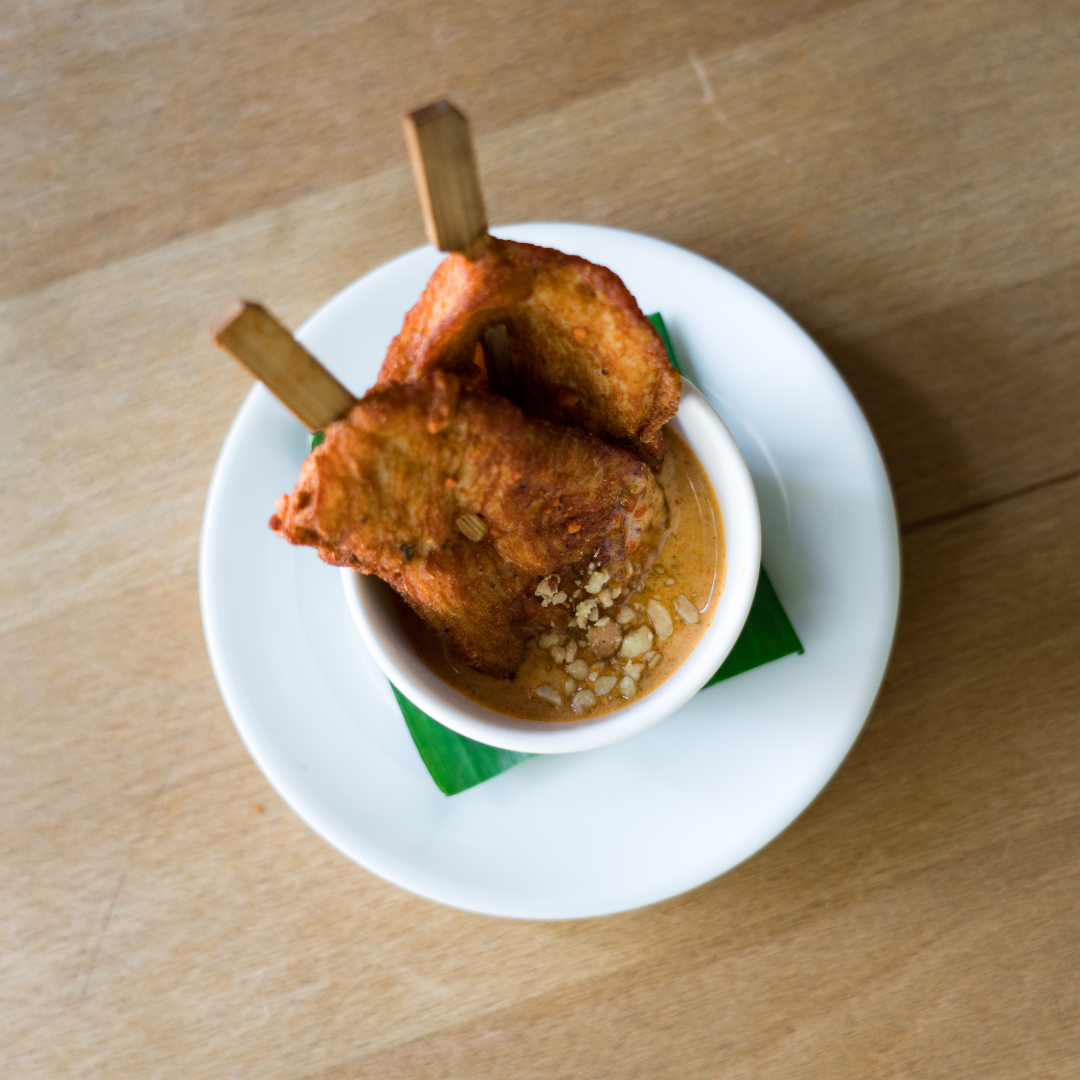 - Chay La Lot – Im Senfblatt gebratener gewürzter Tofu, auf kleinem Spiessli (glutenfrei, vegan)